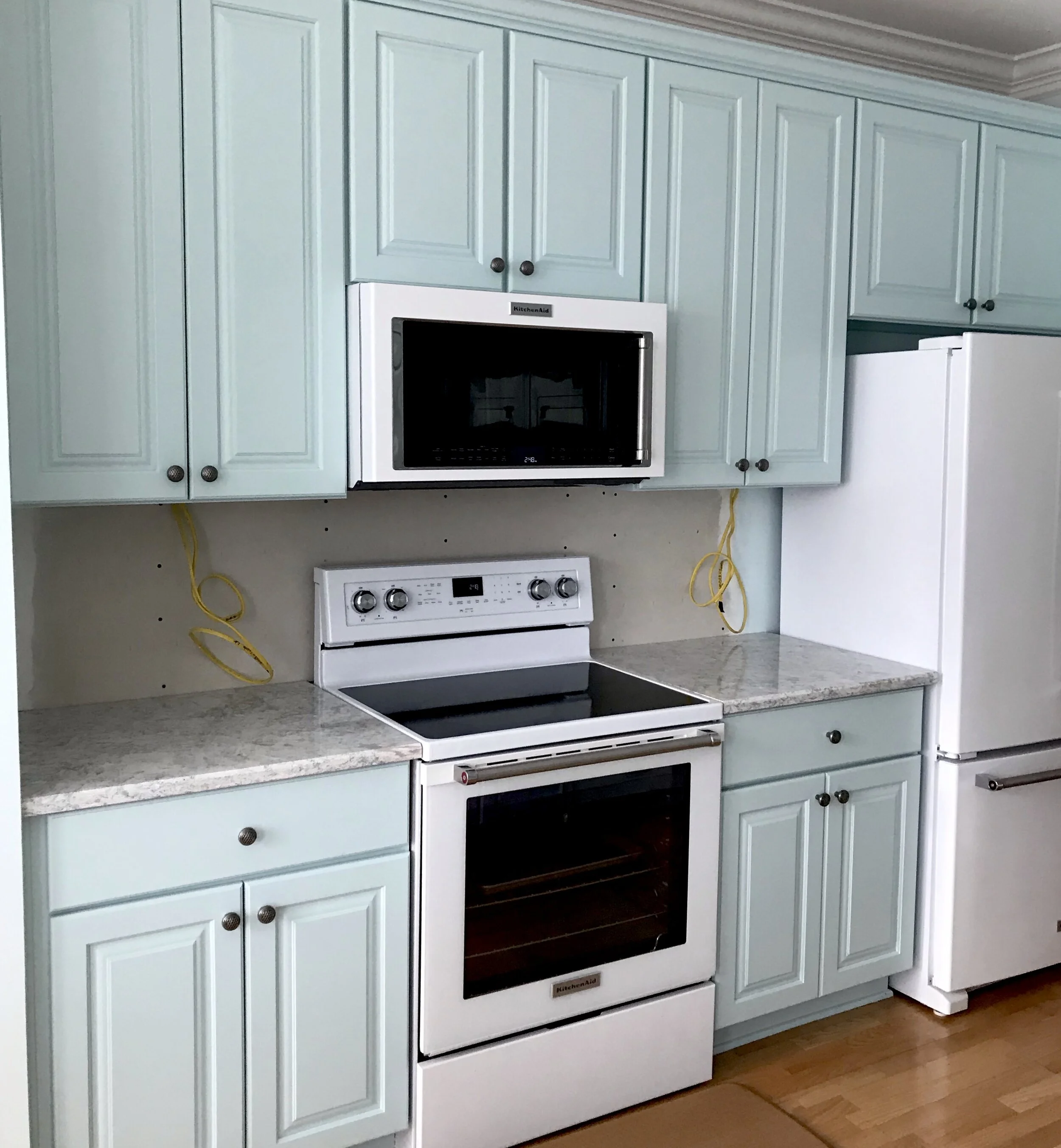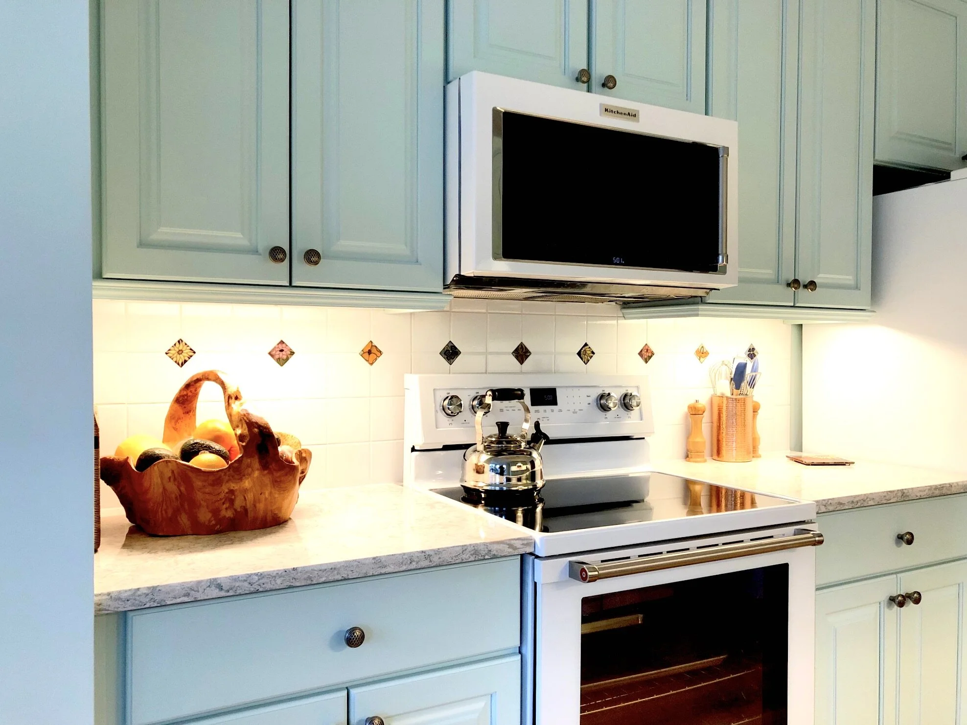 Being young at heart, Nancy dresses in bright, clean colors like aqua, hot pink, and red (aqua being her favorite). It was no surprise when she said she wanted to paint her cabinets and walls pale blue. Because ceramic glazes are one color when you apply it and another color fired, I'm pretty good at imagining things finished, but all I saw was blue. She was confident, and the rest of her place is beautiful. I chose to trust her process watch her happily plan her new kitchen.