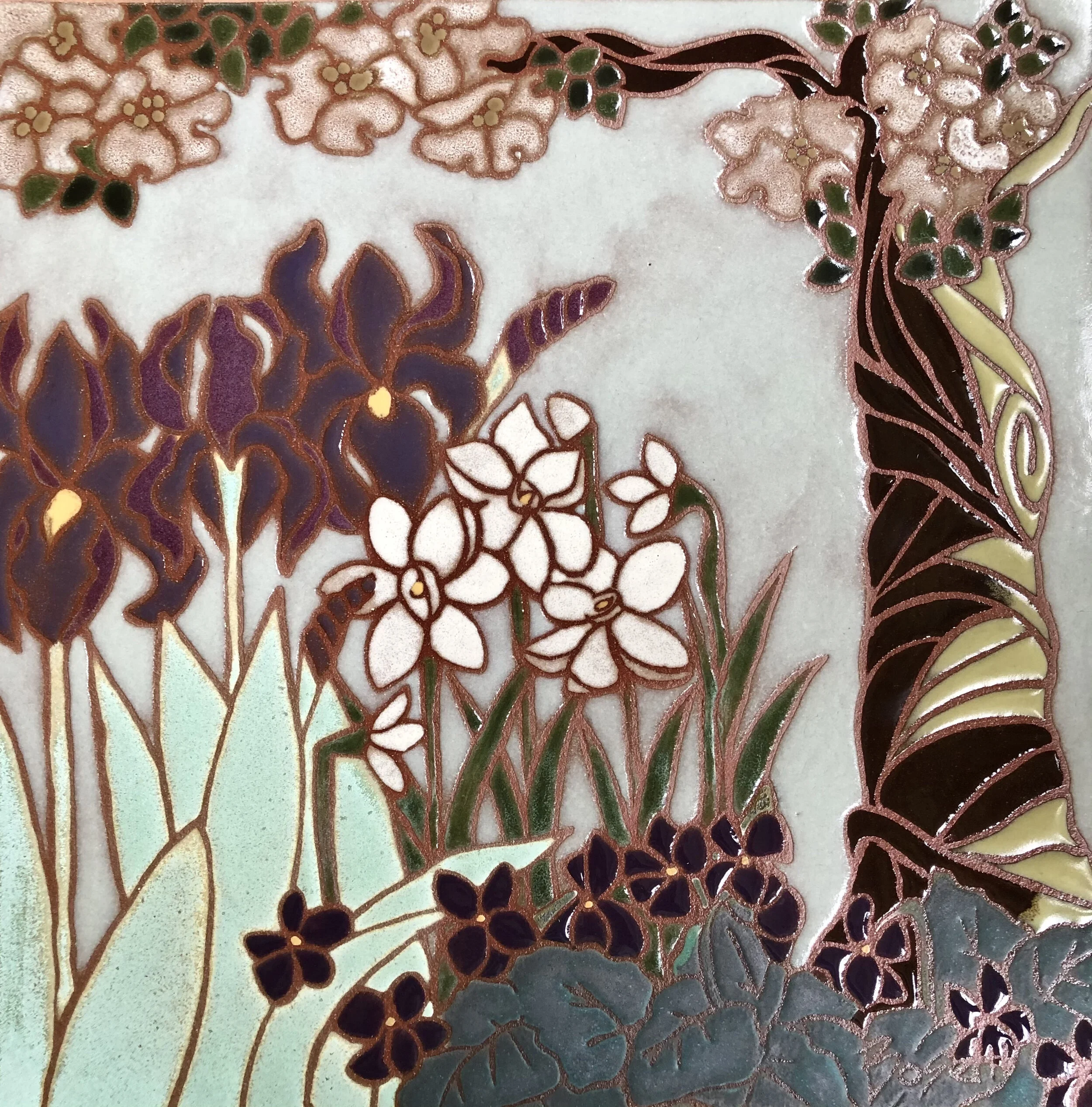 First is a kitchen backsplash. The kitchen design will feature a 20" X 20" mural behind the sink depicting Raleigh in the Spring, with dogwoods, iris, violets, and narcissi. A smaller mural, 6" x 18", of violets will go above the stove. Incorporated into the violet piece will be a ladybug and a bee, representing and hopefully delighting the owner's granddaughters. The homeowners discovered me a while ago at the Boylan Heights ArtWalk, a neighborhood art event that's been happening for over 25 years. ArtWalk promotes Raleigh artists and the shop local philosophy.