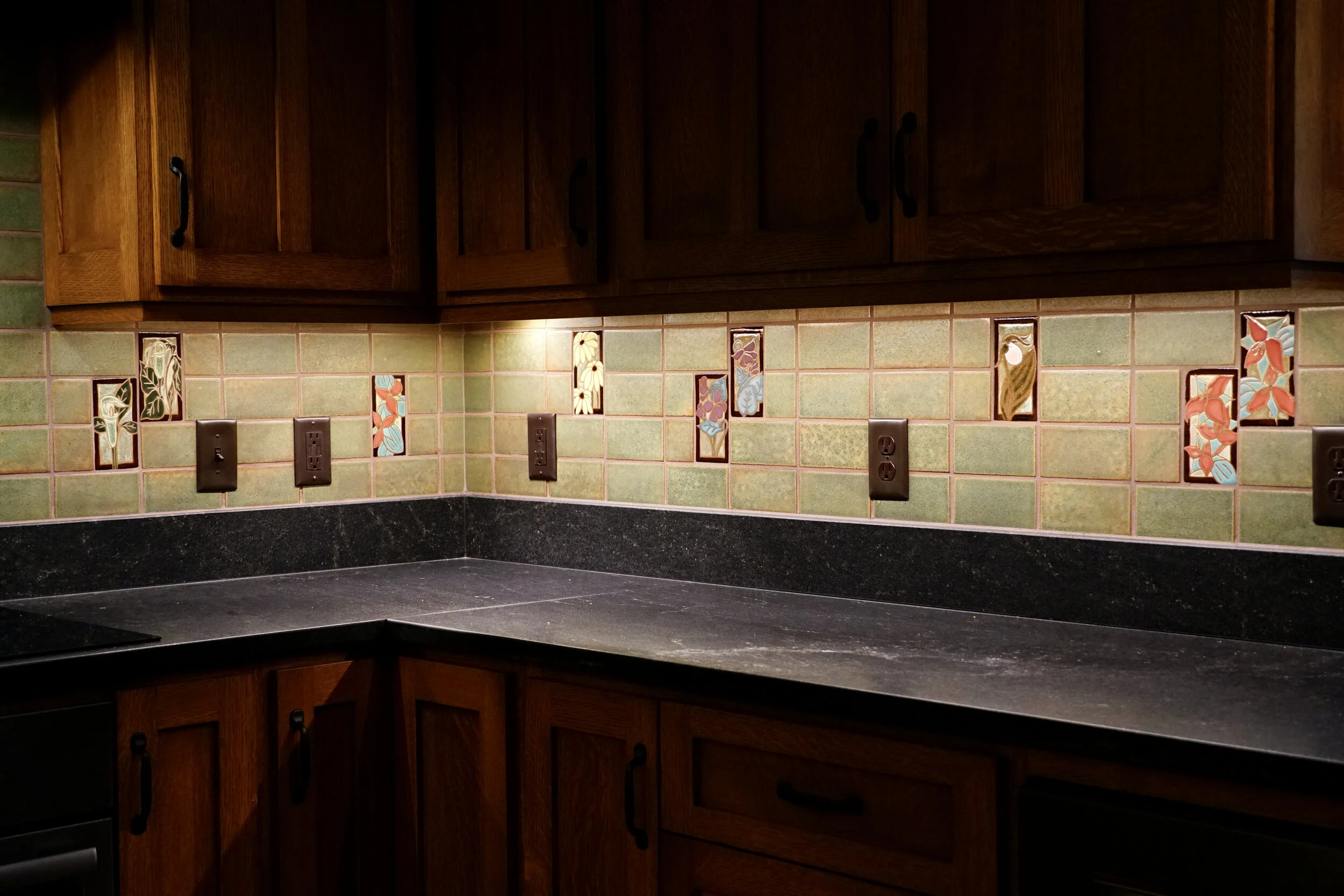 I love this owner's unique use of decos, the 3” x 6” tiles scattered in the kitchen backsplash. They’re larger versions of the trilliums, black-eyed susans, violets, lady slippers, and jack in the pulpits found in the main mural.