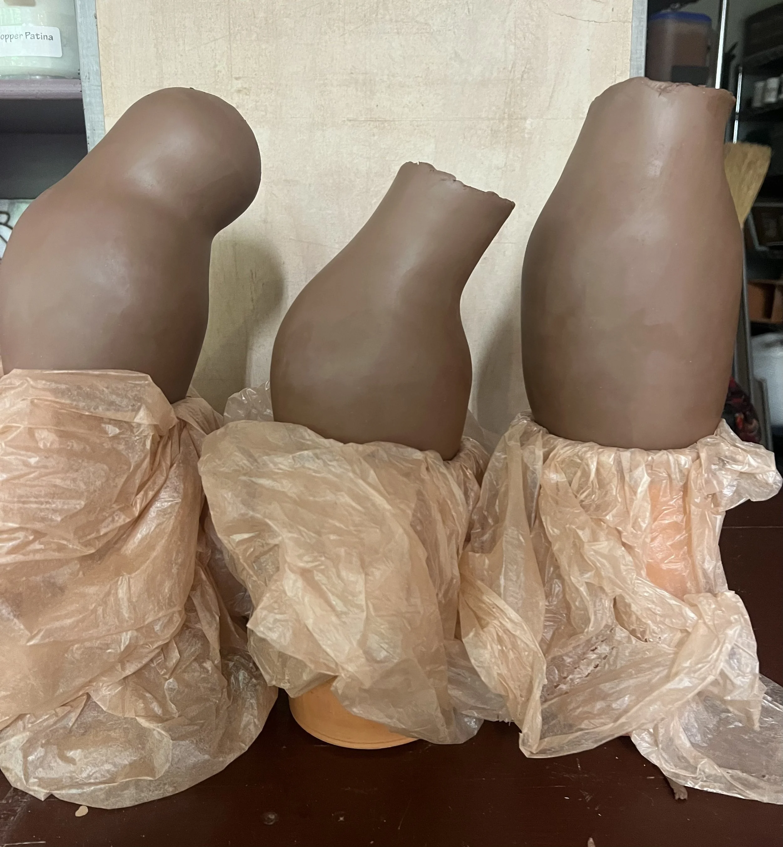 The second batch of cone shapes resting in bisque vases while I was working on the heads.