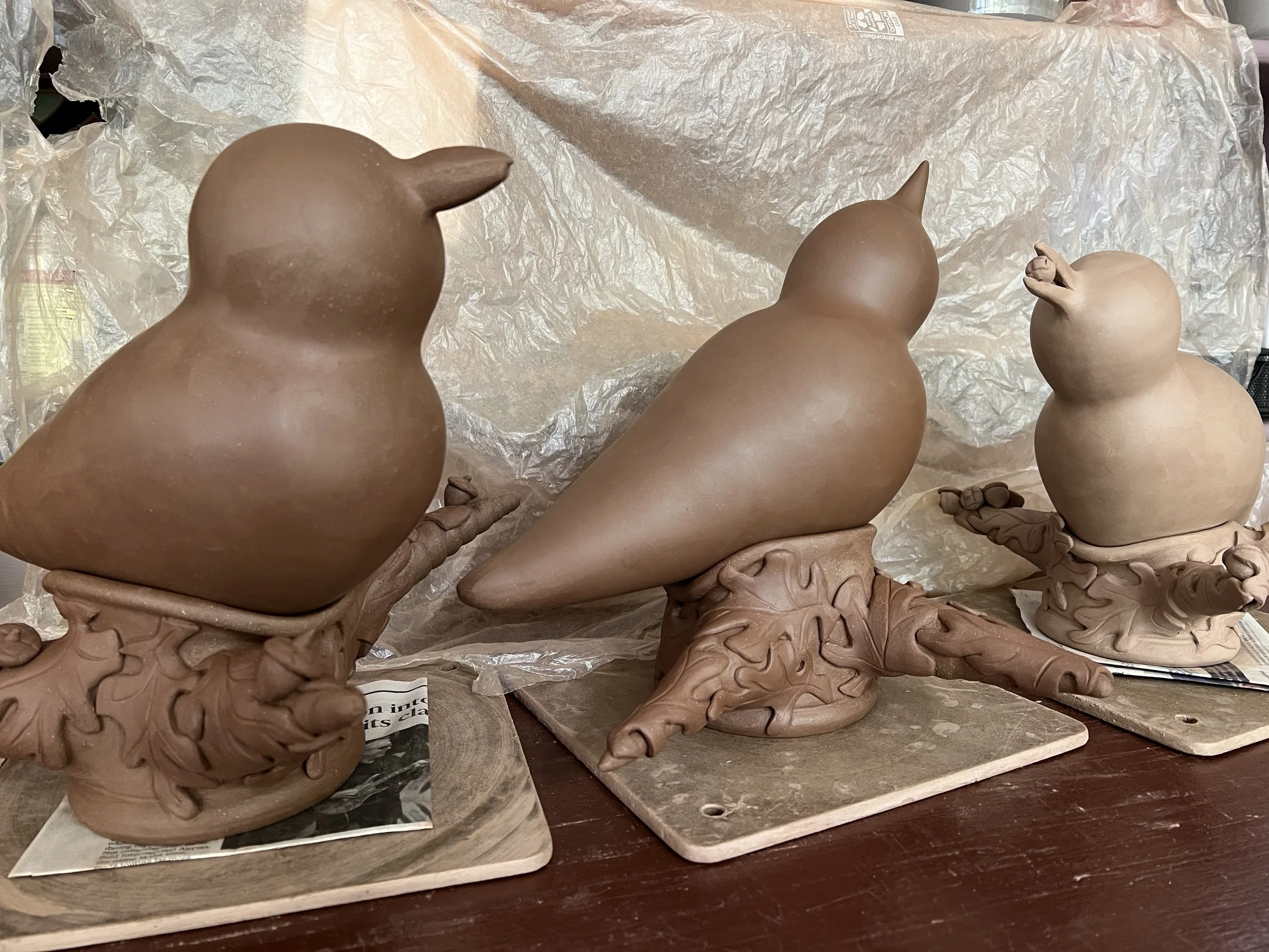 I took a break from the tower project to make a few bird sculptures. But decorating it will begin this weekend. I can't wait to see it finished, with lavender hydrangeas, colorful zinnias, and a cardinal flower vine twisting its way around the column attracting hummingbirds and mythical creatures. I'm enthusiastic about sharing the results with you. With the project and building stock for the Boylan Heights ArtWalk, many pictures will come your way over the next few weeks.