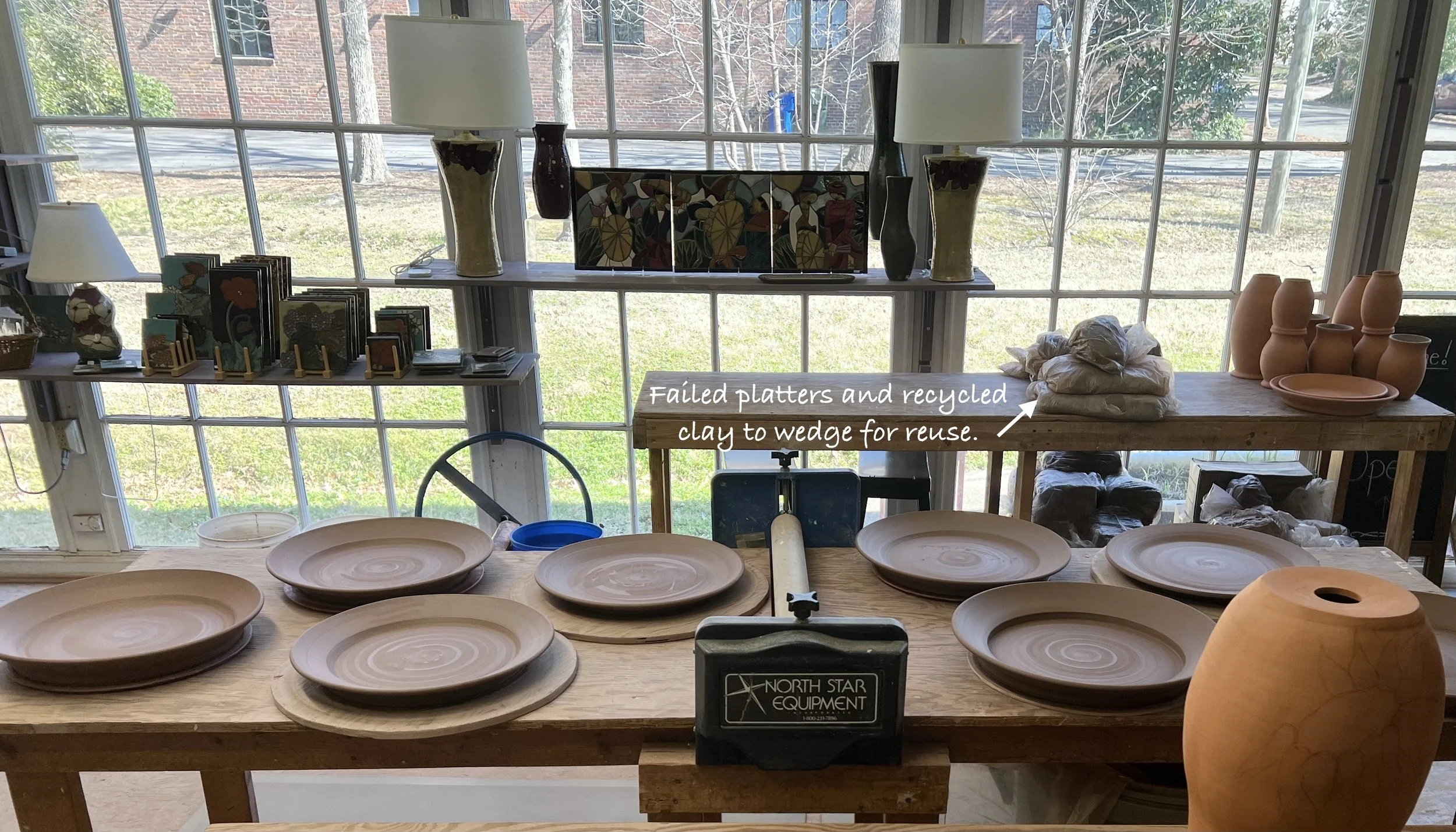 A good days work, one hundred lbs of clay used, eight platters, and reclaim clay waiting to be wedged.