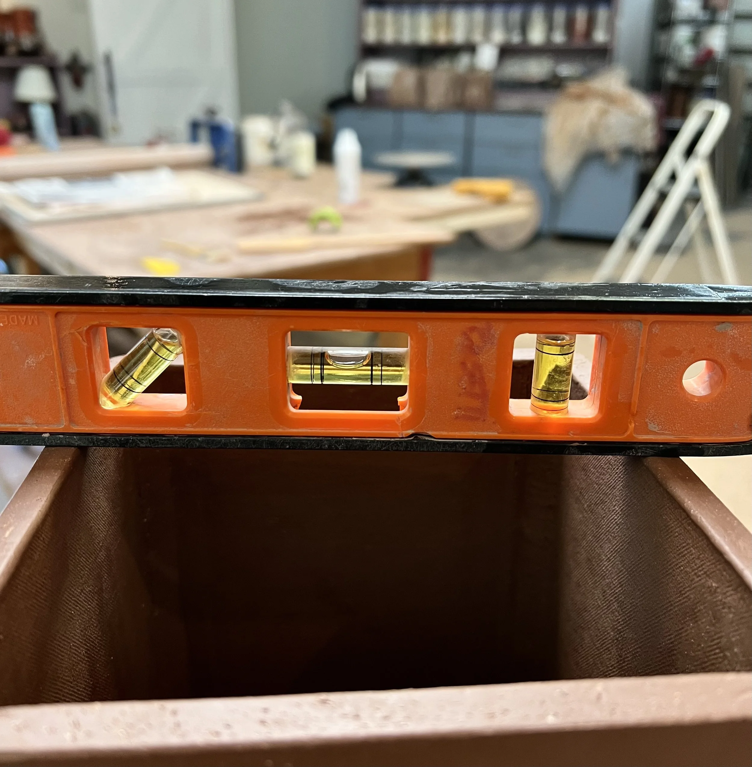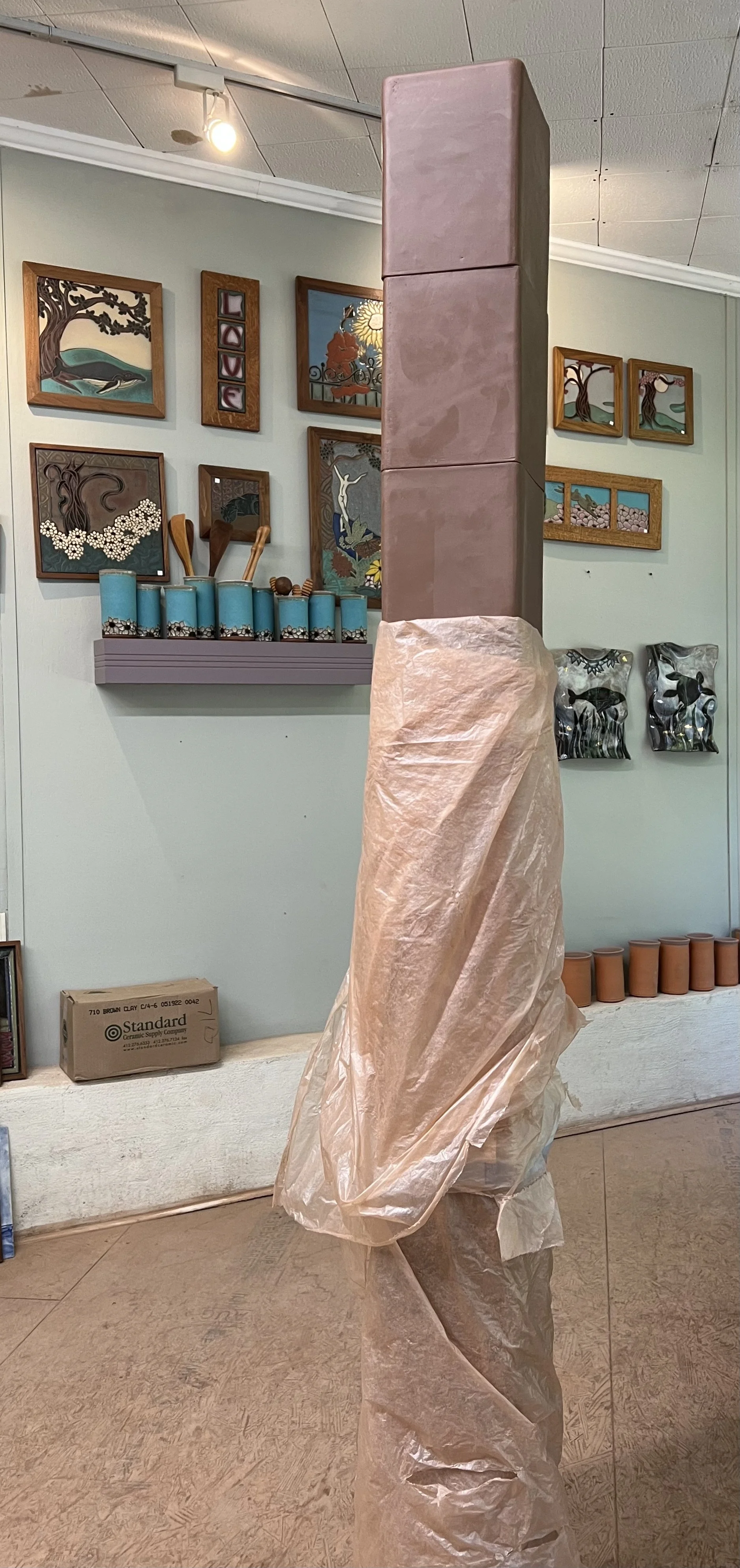 The post is 4.5" square and 5'9" tall. To account for shrinkage (clay shrinks when fired), I'm building nine blocks, 6.5" by 8.5". I've made a dozen blocks and thrown a disc for a base as of Monday. I'm fitting the blocks together this week to ensure they line up. Then I'll number them, allowing me to put them back in order after the bisque firing for glazing.