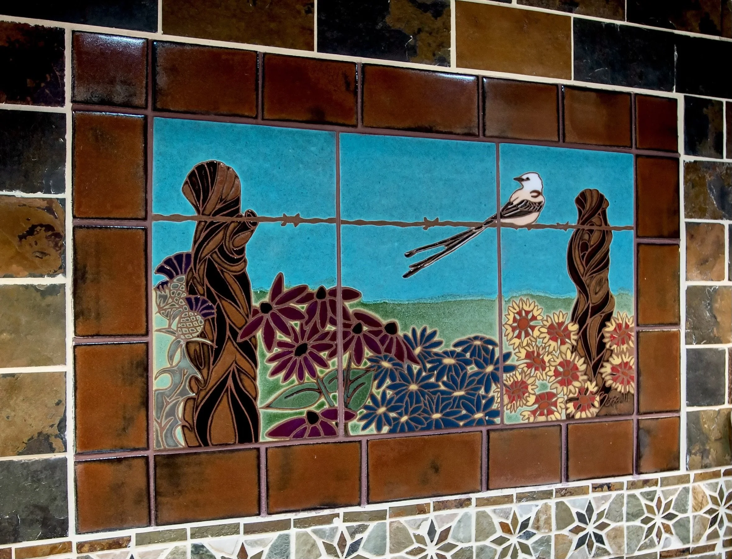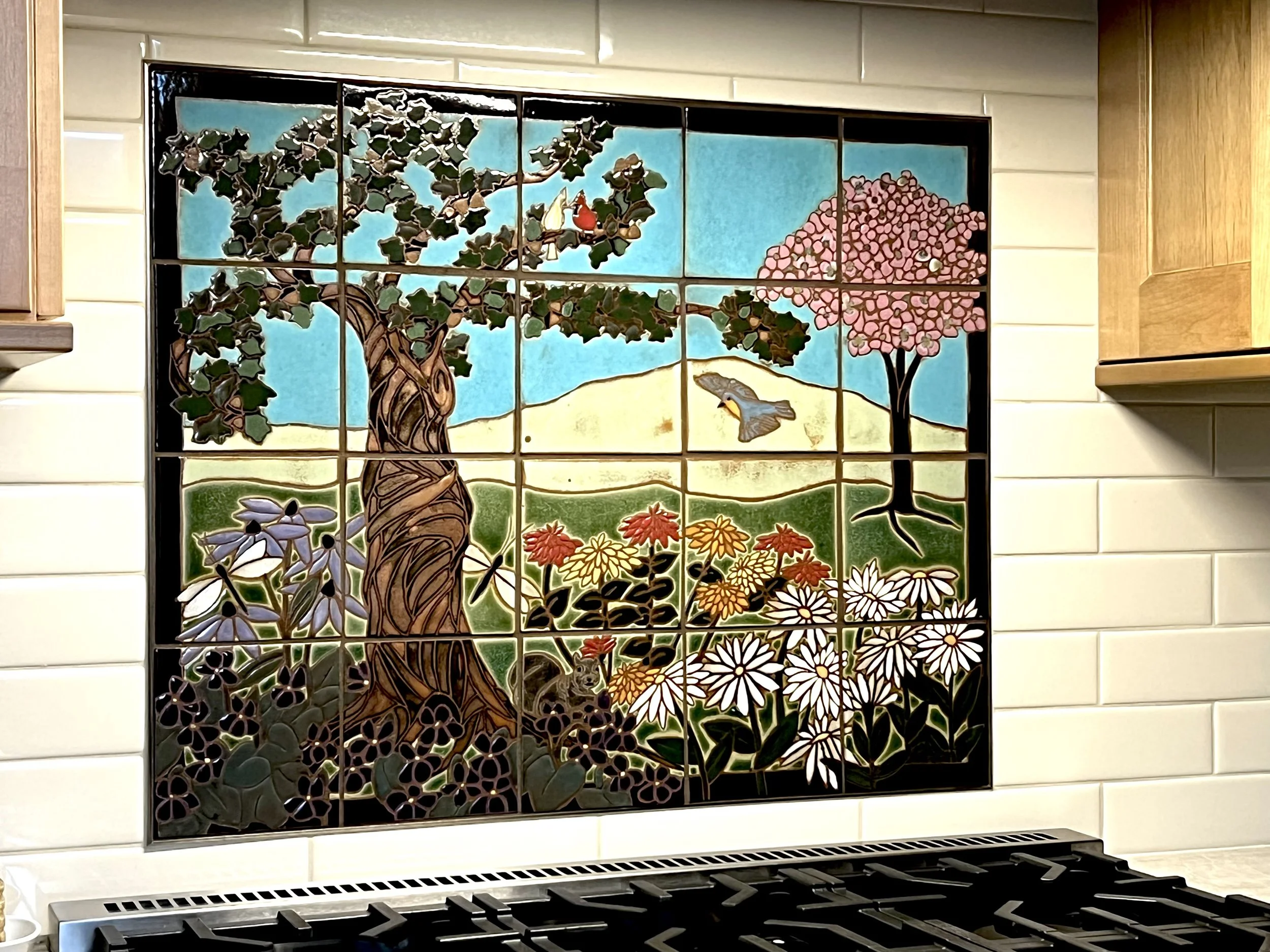 Raleigh centric flora and fauna backsplash with daisies, zinnias, oak tree, cardinals, and dogwood tree.