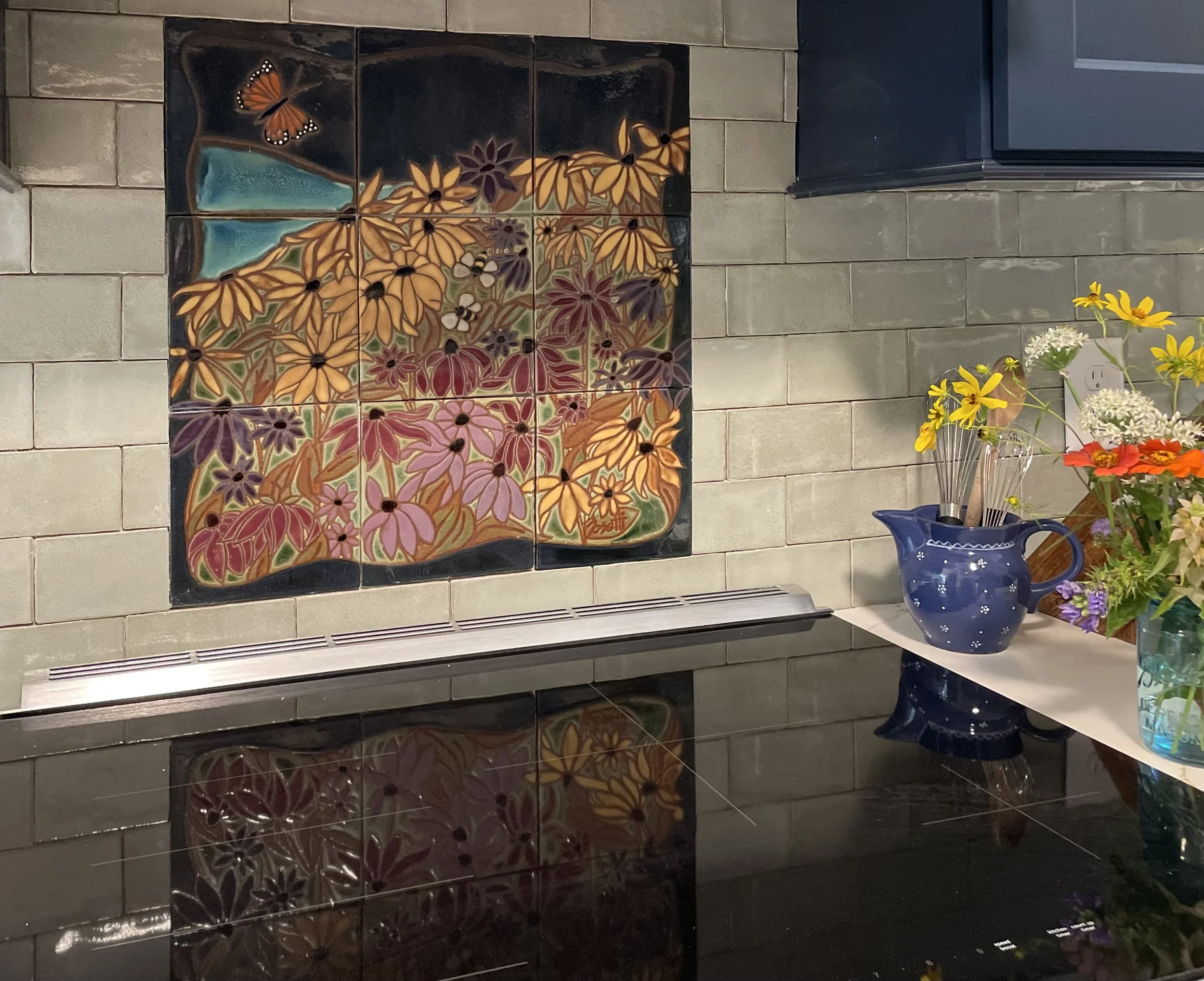 Cheerful and glowing under the moonlight, this night sky mural with black-eyed susans, echinacea, a few bees, and a monarch butterfly creates a cheery ceramic piece that brightens this light-filled kitchen.