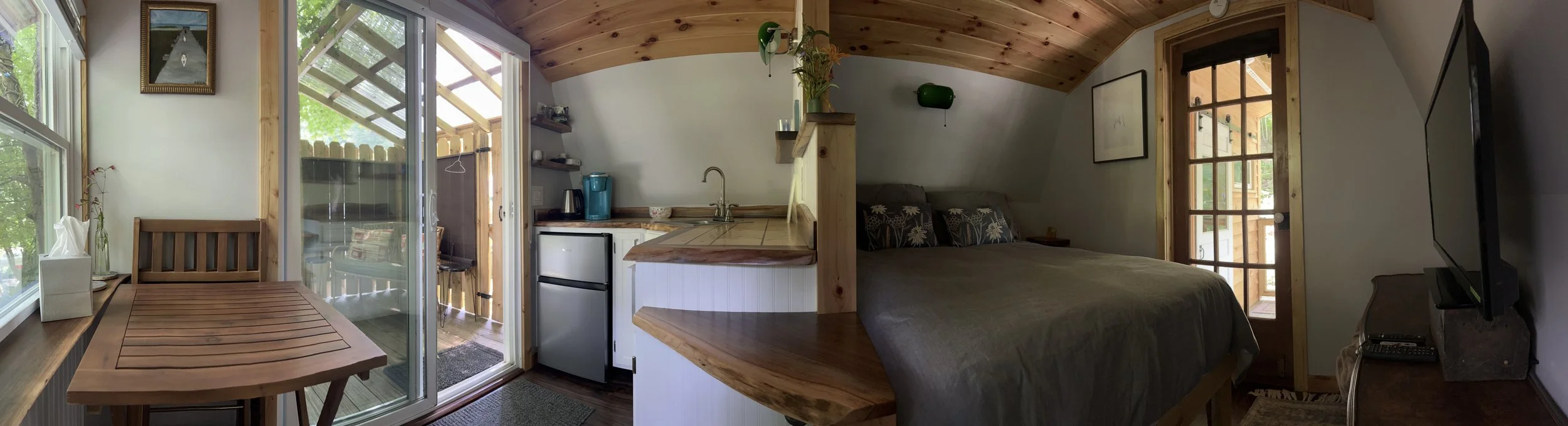 In this image, you can see that I have a small dining table for two (I keep the chairs folded up). The kitchen has a fridge with a freezer and a boat-sized sink. and counter space for food prep. I do most of my cooking, so I prep everything first and move it to the left side of the sink. I can choose from an induction cooktop, an air fryer, or a microwave to cook. They're stored in the cabinet below. This section of the house is 10' x 12', not much bigger than the 10' x 10' booths you see at craft fairs. To take this picture I am standing against the wall between the table and the TV.