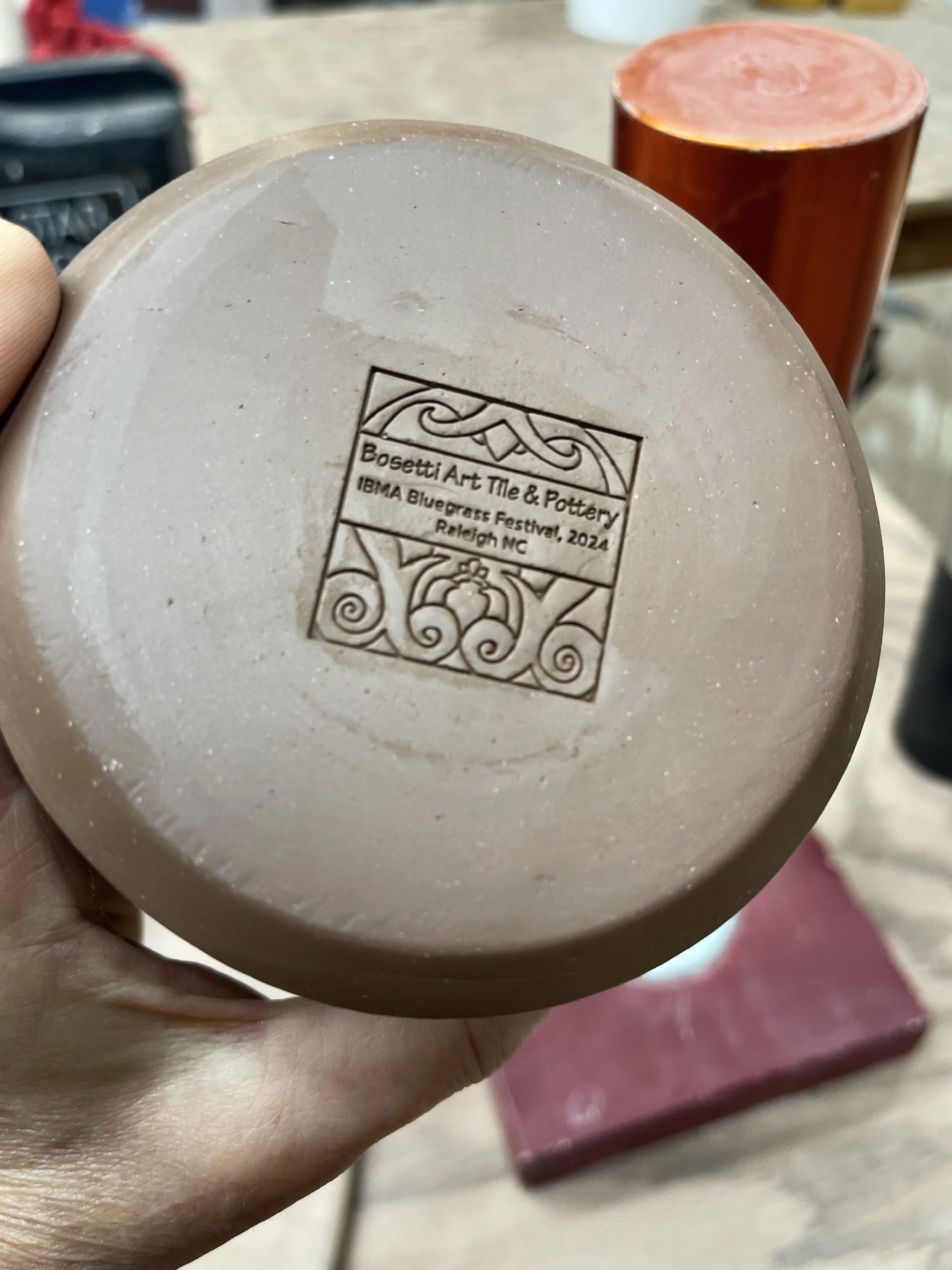 The wide open bluegrass mug has an acorn mandolin with 2024 next to the “h” in Raleigh.